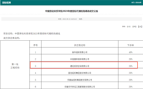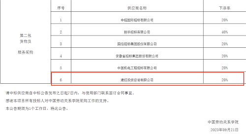 近日,中國(guó)勞動(dòng)關(guān)系學(xué)院2023年度招標(biāo)代理機(jī)構(gòu)遴選項(xiàng)目成交公告發(fā)布,我公司成功入選中國(guó)勞動(dòng)關(guān)系學(xué)院2023年度招標(biāo)代理機(jī)構(gòu)(第一包工程和第二包貨物及服務(wù))。