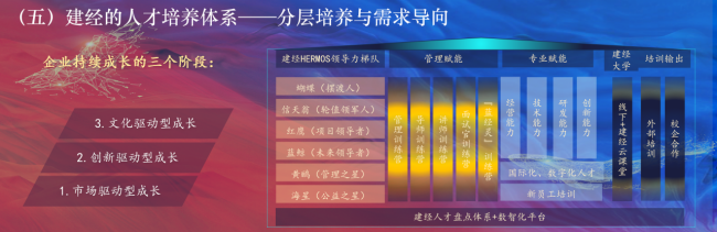 談及人才培養體系,黃志挺董事長重點介紹了建經咨詢的“人才發展全景圖”。該體系以“建立標準與持續賦能”為核心,構建了覆蓋“人才標準平臺、人才發展平臺、人才成長平臺”的全生命周期管理模式:在人才標準層面,通過勝任力模型與任職資格評定明確能力坐標,依托崗位序列與職級序列規劃職業路徑,結合人才評價與績效管理實現精準畫像;在人才發展層面,通過領導梯隊、核心梯隊建設儲備后備力量,借助繼任計劃與輪崗機制激活人才活力,以“選用育留”全流程管理實現動態優化;在人才成長層面,以“識能、使能、賦能”為邏輯,通過黨建引領與文化傳承凝聚共識,讓人才在企業發展中實現價值共生。